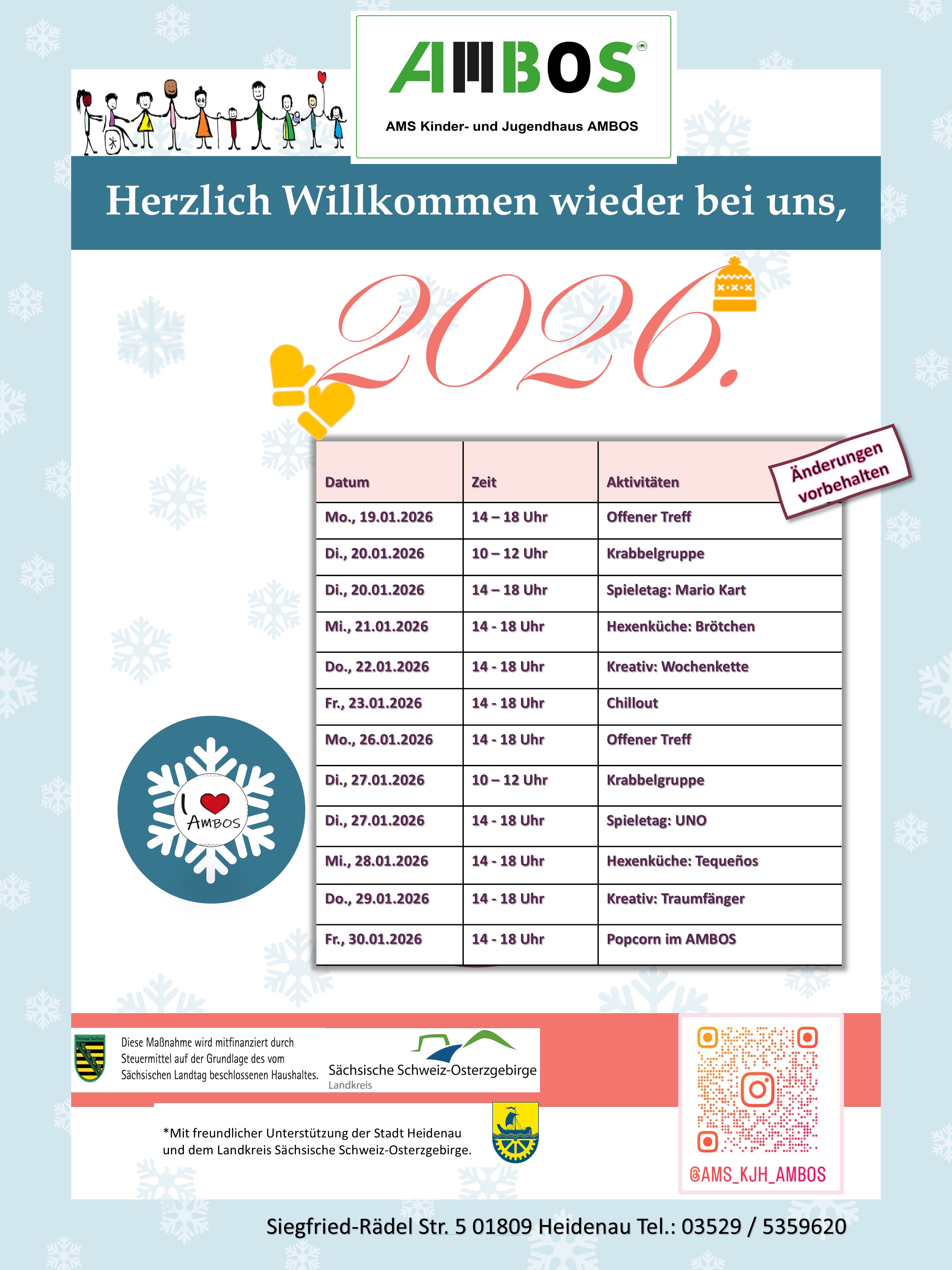 Die regelmäßigen Angebote in unserem Wochenplan sind unter anderem die Krabbelgruppe jeden Dienstag von 10:00 – 12:00 Uhr für Eltern mit Kleinkindern von 0 bis 3 Jahren, für alle Familien. Gemeinsam mit der Stadtbibliothek führen wir das Bibo -Basteln Donnerstags durch. Auch sind wir bei den Veranstaltungen der Stadt, wie die Vereinsmeile oder das Adventsbasteln zum Weihnachtsmarkt vertreten. Aktuelle Änderungen sind auf den Flyern zu finden. Bei Fragen sind wir unter: 03529/5359620 zu erreichen.