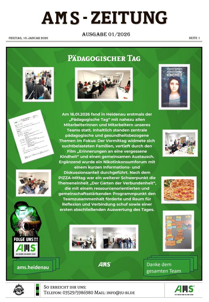 Unsere Firmenaktivitäten – Vielfältige Angebote für die berufliche Zukunft: Unsere Angebote sind darauf ausgelegt, jungen Menschen nicht nur Fachwissen zu vermitteln, sondern auch Selbstbewusstsein und Eigenverantwortung zu fördern. Egal ob Talententdeckung, Berufsvorbereitung oder die gezielte Entwicklung individueller Fähigkeiten – wir begleiten auf dem Weg. Am 16.01.2026 fand in Heidenau erstmals der „Pädagogische Tag“ mit nahezu […]