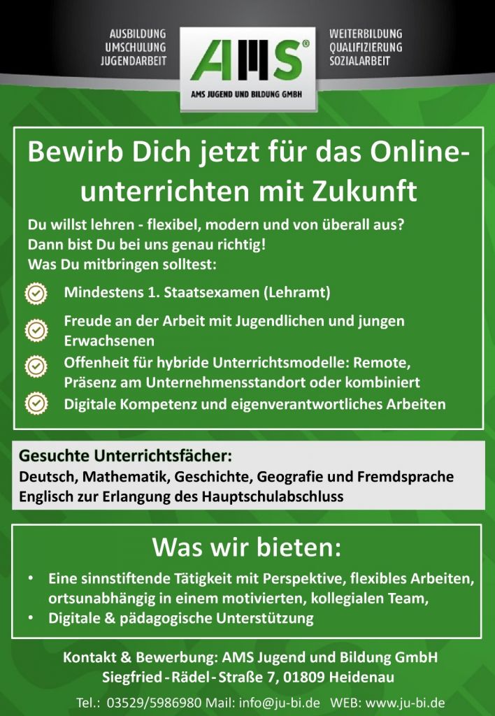 * Mindestens 1. Staatsexamen (Lehramt) * Freude an der Arbeit mit Jugendlichen und jungen Erwachsenen * Offenheit für hybride Unterrichtsmodelle sowie digitale Kompetenz und eigenverantwortliches Arbeiten