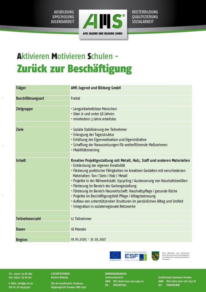 Im Vorhabensbereich „Beschäftigung und soziale Integration für am Arbeitsmarkt besonders benachteiligte Menschen (Programmlinie Schritt für Schritt)“ der ESF-Richtlinie SMS führt die AMS® nunmehr am Standort in Freital das Projekt durch. Ziel des Vorhabens ist die Verbesserung der Beschäftigungsfähigkeit von Langzeitarbeitslosen, die soziale Stabilisierung, das Erlangung einer Tagesstruktur, die Erhöhung der Eigenmotivation und Eigeninitiative, das Erlangen praktischer Fähigkeiten und Fertigkeiten, verbunden mit dem Erwerb theoretischer Kenntnisse, die Vorbereitung auf berufliche Qualifizierung oder Arbeitsmarktintegration sowie die Schaffung der Voraussetzungen für weiterführende Maßnahmen.